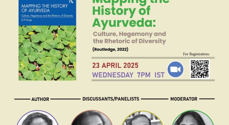 We’re excited to host a discussion on Mapping the History of Ayurveda: Culture, Hegemony and the Rhetoric of Diversity (Routledge, 2022) by the author KP Girija (consultant and Coordinator of the Narayana Guru Digital Research Resource Platform) on Wednesday, 23 April 2025, at 7 pm IST.
